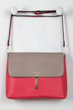 This classic handbag features two-tone vegan leather, front flap with rectangular tuck lock clasp, back zipper pocket, and top zipper closure. Interior features multiple pockets and full lining. Bag is finished with removable adjustable shoulder strap (22" drop).