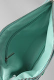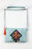 This striking vegan leather crossbody clutch features a square shape embroidered design, vintage coins embellishment, and round mirror stud detailing at front. Also features an interior zipper pocket, fabric lining, and top zip closure with contrasting tassel at the end. Finished with a removable crossbody shoulder strap that has a 23.5" drop.