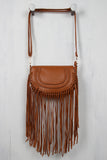 This bag features textured vegan leather, braided accents on front flap, long fringe, and top zipper closure. Interior features pockets and full lining. Bag is finished with removable adjustable shoulder strap (15.5" drop).