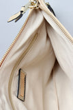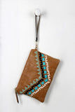 This vintage clutch features a contrasting vegan leather stitching detail at front, top zipper closure, and detachable wrist strap. Finished with one interior zipped pocket, and full lining.