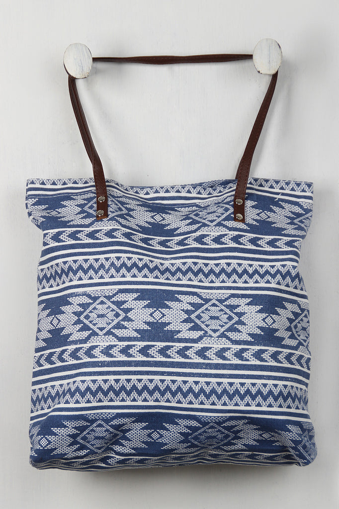 This tote bag features canvas fabrication, a tribal pattern throughout and vegan leather handles and magnetic button top closure.