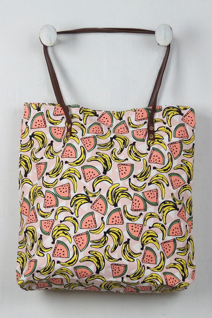 This tote bag features canvas fabrication, a watermelon and banana pattern throughout and vegan leather handles and magnetic button top closure.