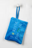 This mini-bag features a soft furry upper, attached wrist strap, embroidered "Forever Summer" with a sun and coconut trees detail, and top zipper closure with anchor. Finished with a waterproof lining.