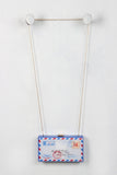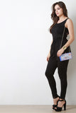 This novelty clutch features a structured rectangle design, letter printed front and back, magnetic latch closure, and a removable chain strap.