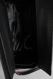 This classic bag features vegan leather fabrication, structured rectangular shape, a folded snap buckle closure, two top handles, an adjustable and removable cross body strap, lined with vegan leather, 1 inner zipper pocket and 2 open pockets. Finished with gold toned hardware and feet.