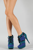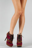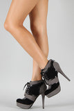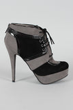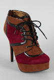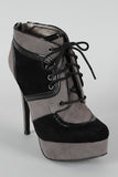 Lift up your ensemble with these two tone platform booties ! Featuring smooth vegan suede upper with leather piping details, round toe, lace up front closure, covered tribute platform, and stiletto heel. Finished with cushioned insole and rear zipper closure for easy on/off.