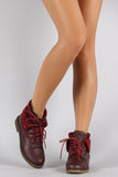 These booties feature a soft sweater cuff, fold over faux fur collar design with snap button detail, rounded toe, and low heel. Finished with cushioned insole and lace up closure.
