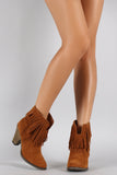 These western inspired fringe accent, slightly round toe, whip stitch detailing, and chunky stacked heel. Finished with cushioned insole, soft interior lining, and easy pull-on construction.