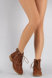 These ankle boots feature a warm sweater cuff design, round toe silhouette, side zipper trims, and low block heel. Finished with cushioned insole, fabric interior lining, and lace up front closure.