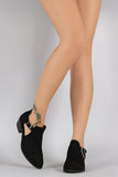 These edgy ankle boots feature a smooth vegan suede upper with perforated detail, narrow toe, side cutout design with buckled strap accents, low stacked heel, and lightly padded insole for comfort.