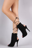 These stylish booties feature a peep toe silhouette, lace up front, back cutout design with corset detail, low hidden platform, and wrapped stiletto heel. Finished with cushioned insole and side zipper closure for easy on/off.