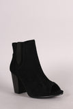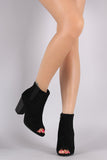 This striking bootie features a perforated vegan suede upper, peep toe silhouette, partial elastic gore insert, and chunky stacked heel. Finished with a lightly padded insole and side zipper closure for easy on/off.