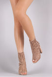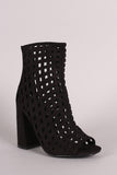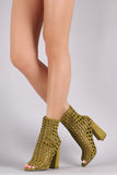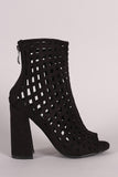 These alluring peep toe booties feature a perforated vegan suede upper, chunky wrapped heel, cushioned insole, and convenient back-zip closure.