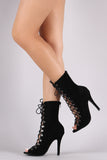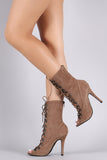 These stunning boots features a soft vegan suede upper, peep toe silhouette, d-rings with lace-up front, and wrapped stiletto heel. Finished with cushioned insole and back zipper closure.