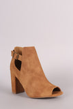 These ankle boots are on a chunky heel, featuring a peep toe opening. Features side slit designs with an adjustable side buckle. Distressed suede design.