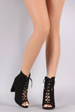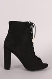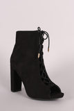 These stylish booties feature a smooth vegan suede upper with lace-up front design, peep toe silhouette, and chunky wrapped heel. Finished with cushioned insole and side zipper closure.