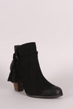These chic ankle boots feature a round toe silhouette, woven ankle straps with tassel detail, and chunky stacked heel. Finished with a cushioned insole, smooth lining, and side zipper closure for easy on/off.