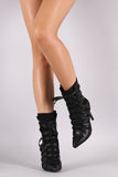These striking pointy toe silhouette, strappy shaft with lace-up design, and stiletto heel. Finished with cushioned insole and rear zipper closure for easy on/off.