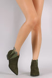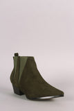 These western inspired ankle booties feature a soft vegan suede upper with elastic gore inset, pointy toe silhouette, and stacked block heel. Finished with a cushioned insole and pull-on construction.