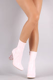 These fashionable boots feature a glossy patent upper, side zipper closure, architectural clear block heel, and cushioned insole for comfort.