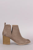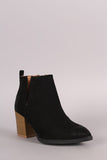 These Western inspired booties features a pointy toe with burnished accent, angle seam detail, side slits, and chunky blocked heel. Finished with a cushioned insole and pull-on construction.