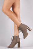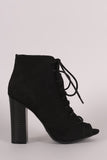 These fashion-forward booties feature a peep toe silhouette, lace-up front, and chunky stacked heel. Finished with a cushioned insole, smooth lining, and side zipper closure for easy on/off.