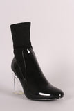 These edgy ankle boots feature a chunky lucite heel, soft vegan suede shaft with a wide elasticized cuff, cushioned insole, soft faux fur lining, and side zipper closure for easy on/off.