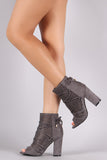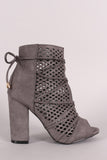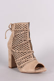 These fashionable ankle boots feature a perforated vegan suede upper with front slit detail, wrapped around lace-up design, peep toe silhouette, and chunky wrapped heel. Finished with cushioned insole for comfort.