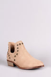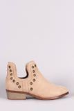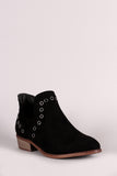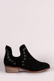 These trendy booties feature an almond toe silhouette, scooped ankle design, grommet trimmed with stitching detail, and low block heel. Finished with a cushioned insole for comfort.