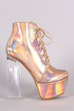 These trendy platform booties feature a round toe silhouette, lace up front, chunky tribute platform, and lucite heel. Finished with cushioned insole, smooth lining, and convenient side-zip closure.