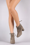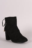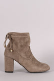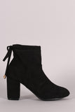 These ankle boots feature a slouchy shaft with stretchy-like material. Top opening has a hidden drawstring bow-tie string, self tie. Round toe. Finished on a chunky heel.