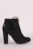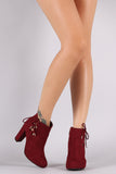 These cute ankle booties feature a rounded toe, side lace up cut out, gold tone metal aglets, wrapped chunky heel, single sole, decorative top stitching pieced details. and a side zipper for easy on/off.