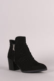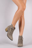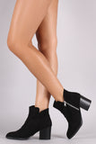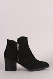 These versatile booties feature a perforated detailing with ruched accents, pointy toe silhouette, asymmetrical collar, and chunky stacked heel. Finished with a lightly padded insole and side-zip closure.