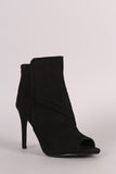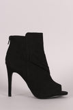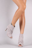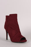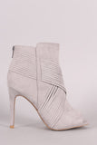 These beautiful booties features a soft vegan suede upper, slashed crisscross straps detail, peep toe silhouette, asymmetrical collar, and wrapped stiletto heel. Finished with a cushioned insole, smooth lining, and rear zip closure.