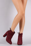 These fashion-forward booties feature a round toe silhouette, soft vegan suede shaft with adjustable drawstring closure, and chunky wrapped heel. Finished with a cushioned insole and side zipper closure.