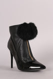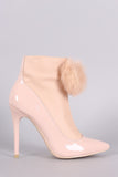 This fashion-forward pointy toe silhouette, wrapped stiletto heel, and exposed zip closure with pom pom pull at front. Finished with a cushioned insole and smooth lining.
