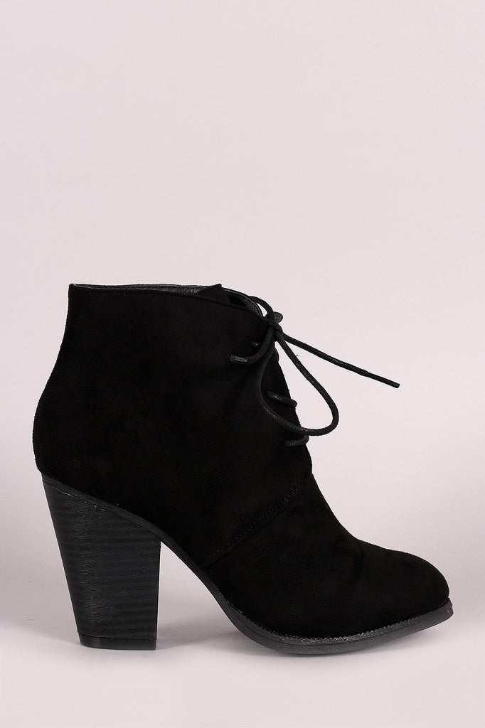 These simple booties feature an almond toe silhouette with lace-up vamp closure, and stacked chunky heel. Finished with a lightly padded insole.