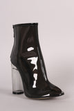 These trendy lucite upper with vegan patent leather trim, center stitched details, peep toe silhouette, and architectural clear round heel. Finished with a cushioned insole and rear zipper closure for easy on/off.
