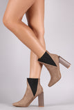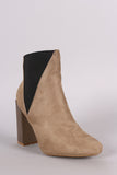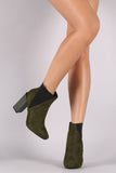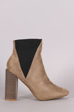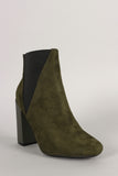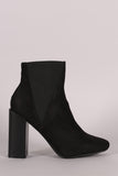These ankle boots are pull on style with stretchy elastic gores on the sides. Almond toe. Light faux fur lining. Finished on a square-like chunky heel.