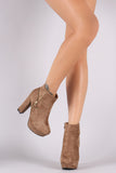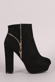 These ankle boots are on an elevated chunky heel and platform; features, a decor outer side zipper and functional inner side zipper. Lightly padded lining.