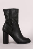 These boots feature a vegan leather upper, stitching detail on vamp, almond toe silhouette, and stacked chunky heel. Finished with a side zip-up closure, lightly padded insole, and faux fur lining.