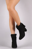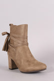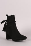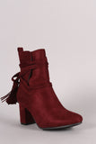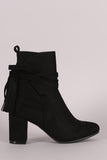 These booties features a soft vegan suede upper, side slits with wrapped around tassel lace tie closure, and covered block heel. Finished with a cushioned insole and smooth lining for all day comfort. Easy pull-on construction with partial side zipper closure for easy on/off.