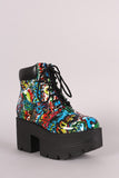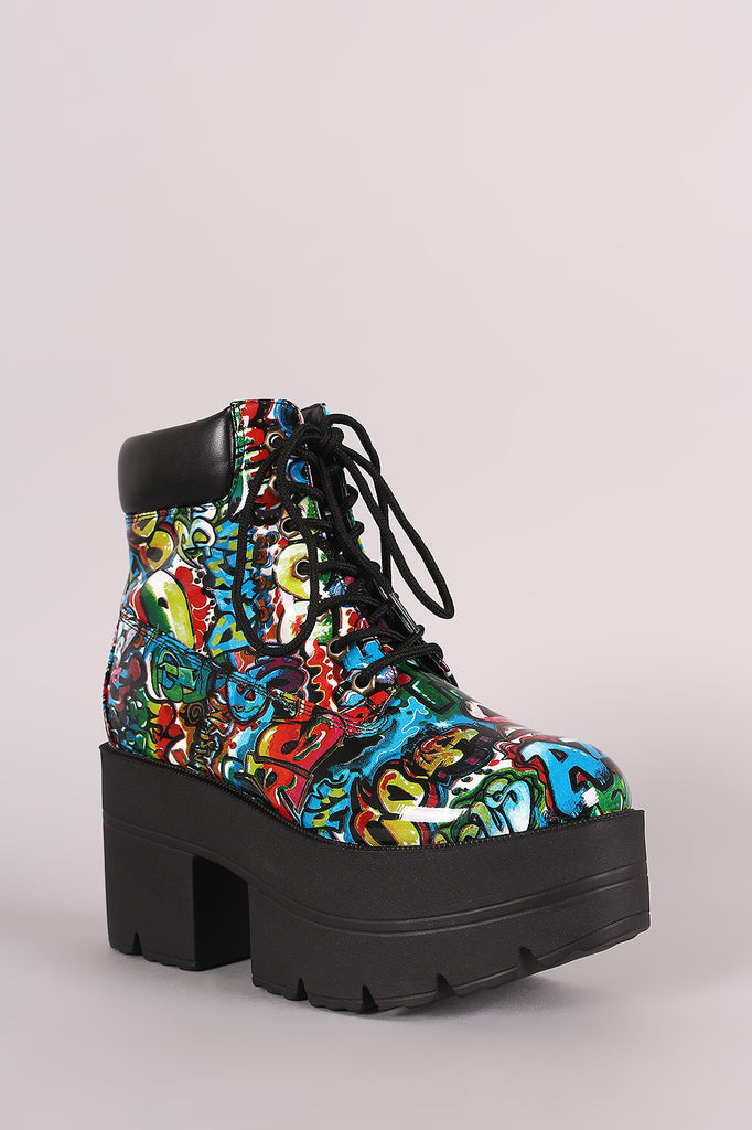 These standout booties feature a graffiti prints upper, round toe silhouette, lace up closure, lug sole, and chunky platform heel. Finished with a cushioned insole and padded collar for comfort.