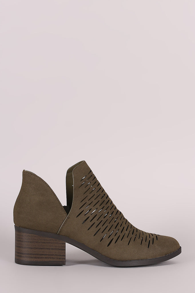 These ankle boots are almond toe silhouette. Slip on style with side slits and a mini adjustable inner side zipper. Laser cut front. Finished on a stacked chunky heel.
