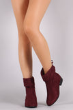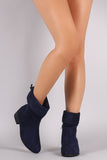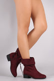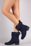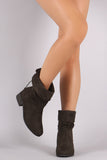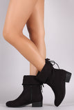 These ankle boots , feature a slouchy shaft with a fold over cuff and an adjustable inner side zipper. Lightly padded lining. Drawstring lace up design at back. Finished on a chunky heel.