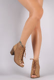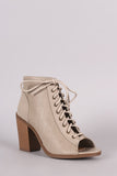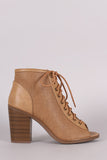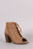 These booties feature a lace up design with a peep toe opening. Embosses perforated sides. Faux leather inside. Finished on a stacked chunky heel.
