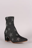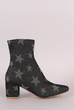 These ankle boots feature a denim upper with allover star print, almond toe silhouette, and blocky wrapped heel. Finished with a cushioned insole and convenient side zip closure.