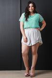 These lightweight plus size shorts featuring a flowy, smooth fabric, petal design at the front, and an elastic waistband. Accessories sold separately. Made in U.S.A. 100% Polyester.