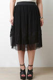 This plus size skirt features a semi-sheer mesh overlay with solid knit fabric underlay, flower print design, wide elasticized waist, and pleated detail. Accessories sold separately. 90% Nylon, 10% Spandex.