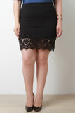This plus size mini skirt features a stretchy textured knit fabrication, elasticized waistband, and wide floral lace trimming at hemline. Accessories sold separately. Made in U.S.A. 96% Polyester, 4% Spandex.